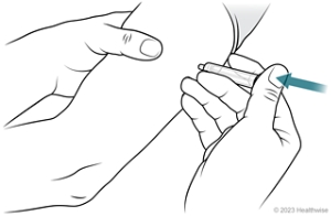 2. Insert the needle. Keeping your fingers off the plunger, hold the syringe like a pencil close to the site. Then insert the needle.