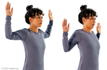 - Bend your elbows and slowly lower your arms while squeezing your shoulder blades down and back. Keep your elbows back and your hands up throughout the exercise. If you're using a wall, keep your arms and hands against the wall. You will feel your shoulder blades slide down and together. At the same time, you will feel a stretch across your chest and the front of your shoulders.