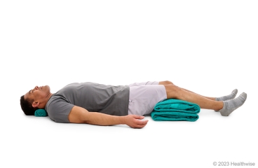 - Lie on your back with a rolled towel under your neck. Support your knees with something, such as pillows or folded towels or blankets. Extend your arms comfortably to your sides.