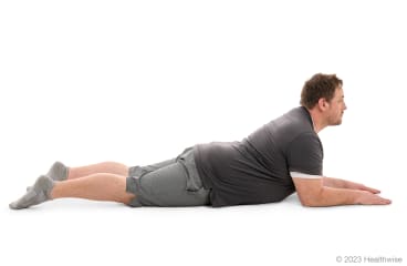 - Lie on your stomach, supporting your body with your forearms. Keep your elbows below your shoulders.
