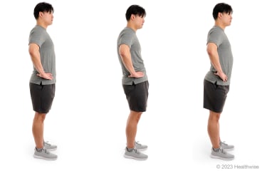 - Bend backward as far as you can, keeping your knees straight. Hold this position for a few seconds. Then return to your starting position.