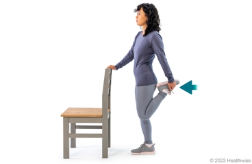 - If you are steady on your feet, stand while holding onto a chair or counter or while resting your hand on a wall. You can also lie on your stomach or your side to do this exercise.