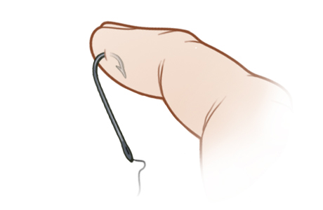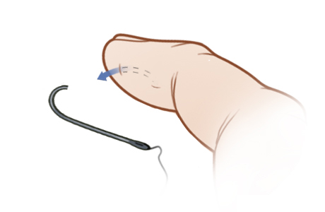 2. Push the hook the rest of the way through the skin so the barb comes out through the skin.