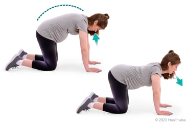 - Breathe in slowly. Tuck your head downward and round your back up, making a curve with your back in the shape of the letter C. Hold this position for about 6 seconds.