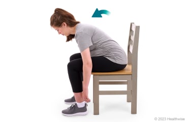 - Breathe out slowly and bring your head back up. Relax, keeping your back straight. (Don't allow it to curve toward the floor.) Hold for about 6 seconds.