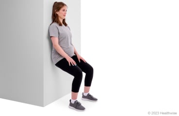 - Slowly slide down until your knees are slightly bent, pressing your lower back against the wall.