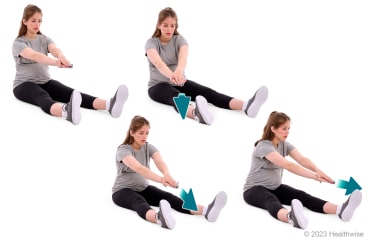 - Stretch your hands forward toward your left foot, then sit up.