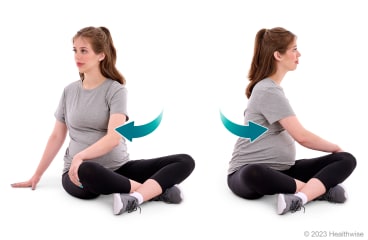 - Reach your left hand toward your right knee. You can place your right hand at your side for support.