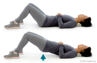 - Lie on your back on the floor, with your knees bent and your feet flat on the floor. (Or you can lie on any flat surface, such as a bed.)