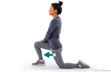 - Keeping your back straight, slowly push your hips forward. You should feel a stretch in the upper thigh of your back leg and hip.