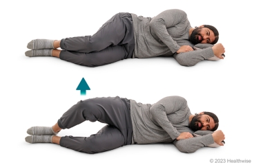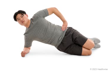 - Lie on your side with your knees bent. Prop your upper body up on your elbow, with your elbow under your shoulder.