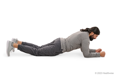 - Lie on your stomach, supporting your body with your forearms. Keep your elbows below your shoulders.