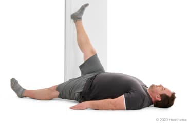 - Slide your affected leg up the wall to straighten your knee. Don't point your toes. You should feel a gentle stretch down the back of your leg. Be sure to: