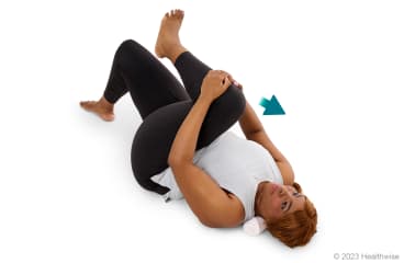 - Use your hands to gently pull your knee toward your opposite shoulder. You should feel a stretch in your buttock and hip.
