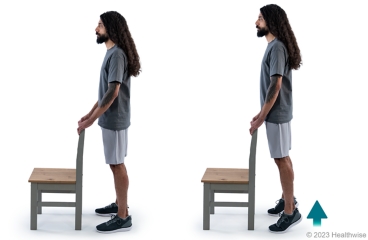 - Slowly raise your heels 1 to 2 inches off the floor while keeping your knees straight. Hold for about 6 seconds, then slowly lower your heels to the floor.