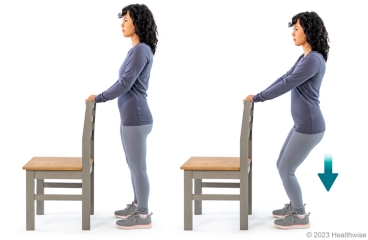 - Stand with your feet a few inches apart, with your hands lightly resting on a counter or chair in front of you.