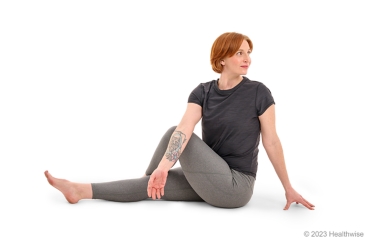 - Twist your shoulders toward your bent leg, and put your opposite elbow on that knee.
