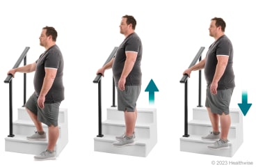 - Use your affected leg to raise yourself up, bringing your other foot level with the stair step. Then slowly bend your knee to lower your foot back down. As you bend and straighten your leg: