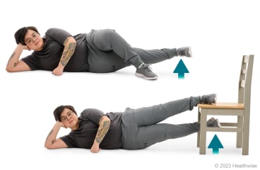 - Lie on your side with your affected leg on the floor.
