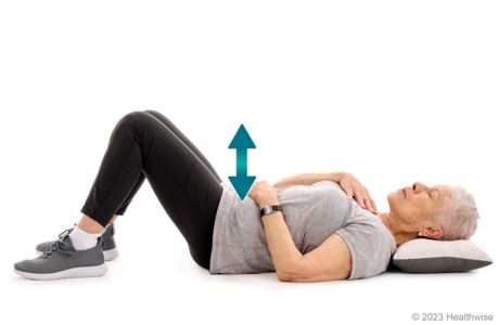 For comfort, you can place a small rolled towel under your neck. Or you can prop yourself up on several pillows. Put one hand on your belly and the other hand on your chest.