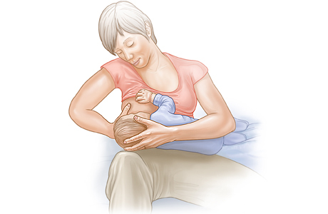 In the cross-cradle hold, your baby's abdomen lies against yours. One hand is low on the baby's head to give control as you bring your baby to the breast to latch. The other hand (on the same side as the breast being used) supports the breast and narrows it to help the baby form a good, deep latch onto the areola.