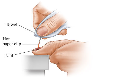 Go slowly, and reheat the clip as needed. A thick nail may take several tries. As soon as the hole is complete, blood will escape and the pain will be relieved.